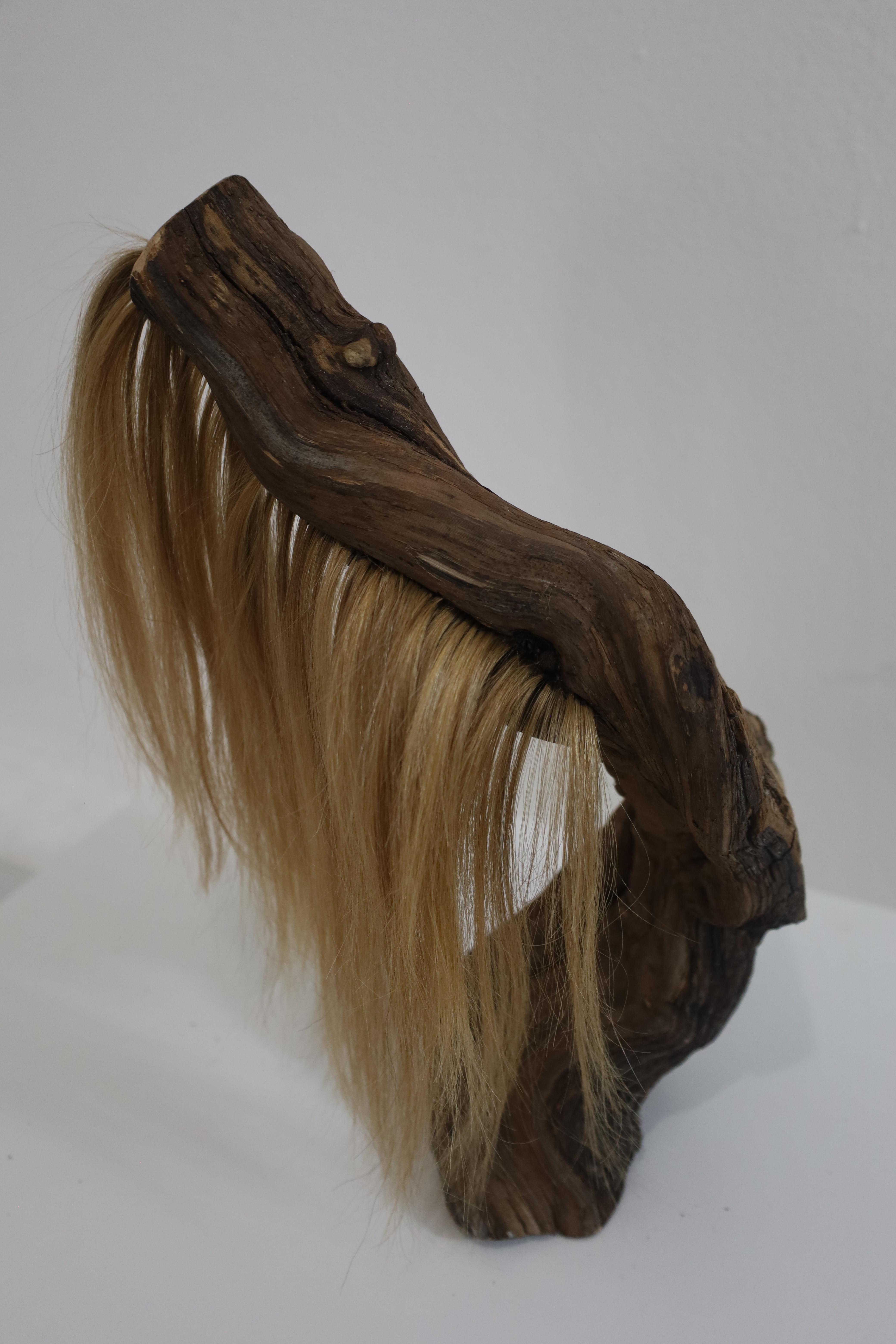 Fasciation 2, 2023, bois et cheveux naturels, détail de l’oeuvre, environs 36 x 26 x 20 cm